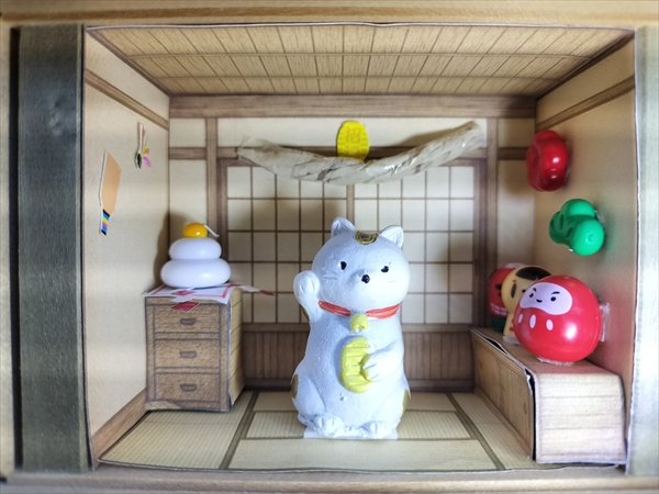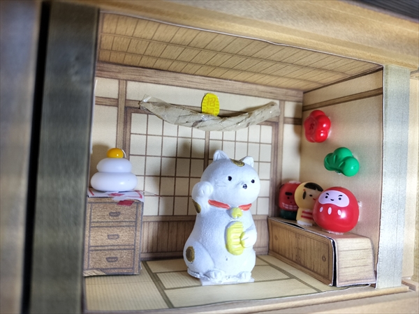 壁紙や家具などの内装は助手のChatGPTに作図してもらい、小物はSeriaやナチュラルキッチンでの仕入れに加え、鏡餅の四方紅や紙垂は普通紙に色を付けて、しめ縄はナプキンを捩って自作しました。